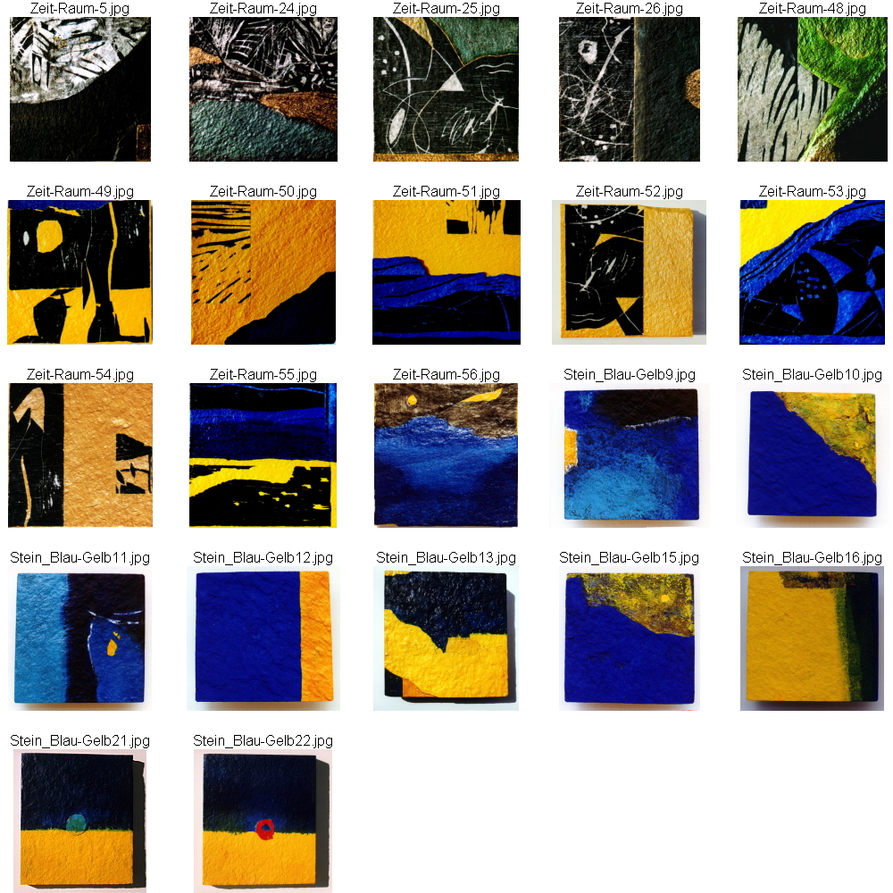 Diese Steinbilder aus den Serien "Zeit-Raum" und "Blau-Gelb" bestehen aus Quarzitstein in der Größe 20x20cm.